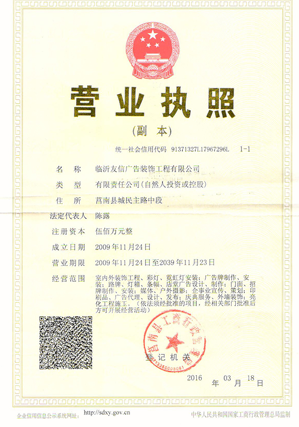 臨沂市友信廣告裝飾工程有限公司是一家從事外漏LED銃孔發(fā)光字、亞克力吸塑發(fā)光字、不銹鋼發(fā)光字、霓虹燈、銅字標(biāo)牌、樹脂字、樹脂發(fā)光字、環(huán)氧樹脂發(fā)光字,不銹鋼字牌、鈦金字牌、金箔字、貼金字、水晶字、不銹鋼燈箱字、超高亮LED燈箱字、發(fā)光燈箱牌、以及鋁合金導(dǎo)向牌、弧面標(biāo)牌等專業(yè)設(shè)計與施工的公司。
